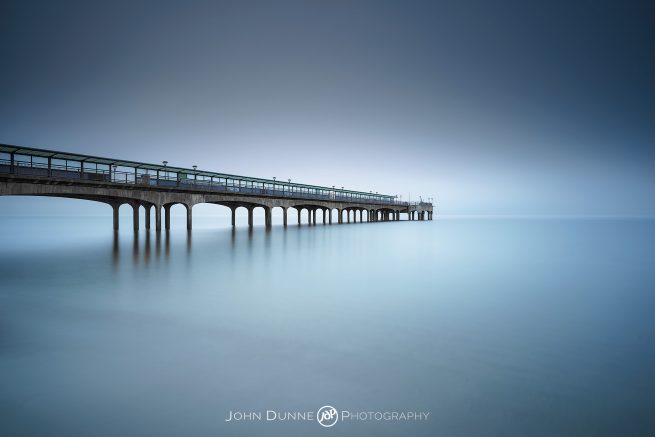 A British Seascape | Sunrise at Boscombe Pier in Bournemouth, England on a foggy morning, creating an beautiful blue glow.